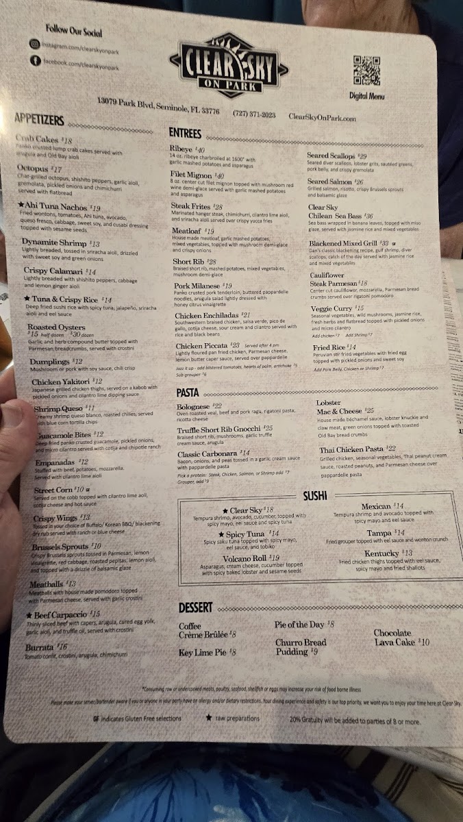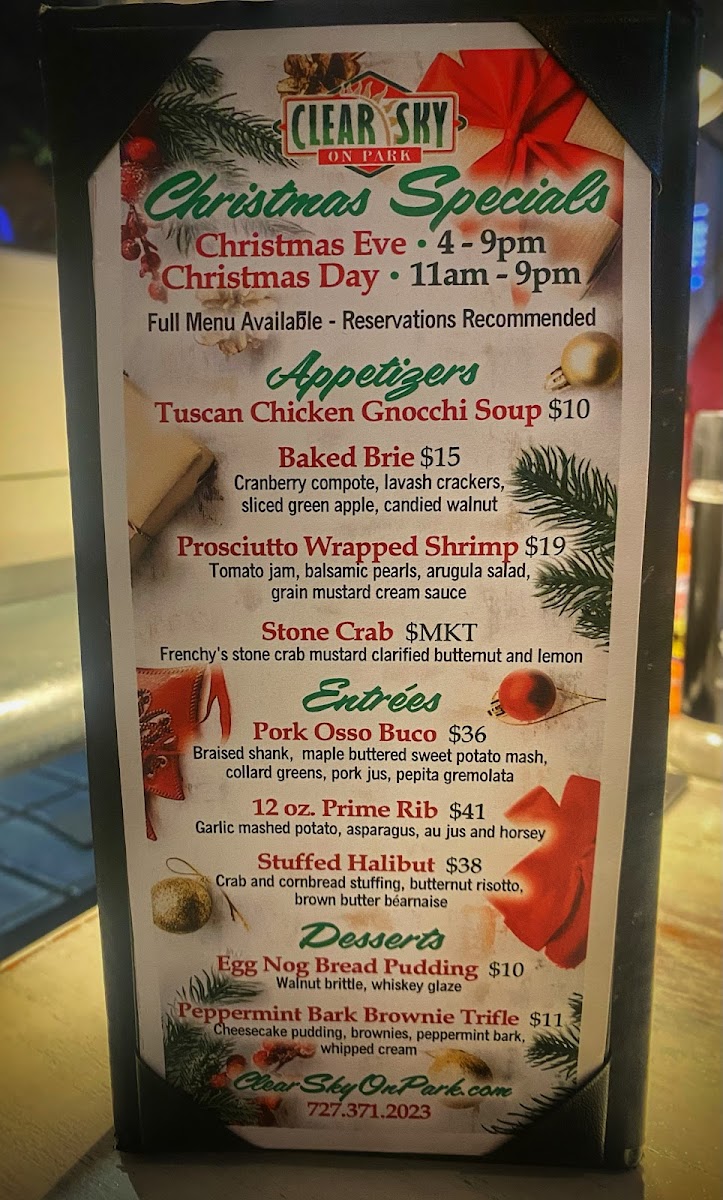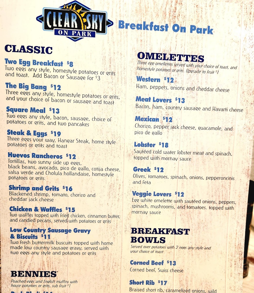 Clear Sky on Park in Seminole, FL offers an inviting American menu that blends classic comfort with fresh, artful presentations. From hearty breakfasts like the flavorful Mexican bowl—with fluffy eggs and fresh guacamole—to standout entrees such as Stuffed Grouper and Chicken Piccata, each dish dazzles with vibrant flavors and thoughtful preparation. The Key Lime Pie is a must-try dessert, perfectly balancing sweetness and tartness.