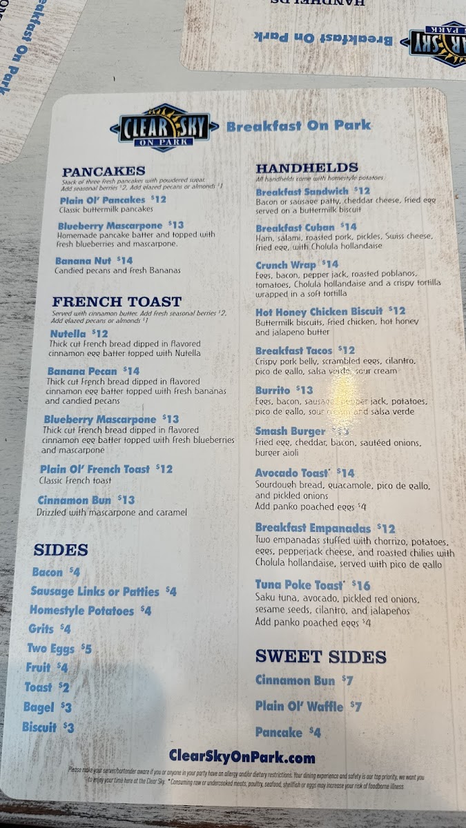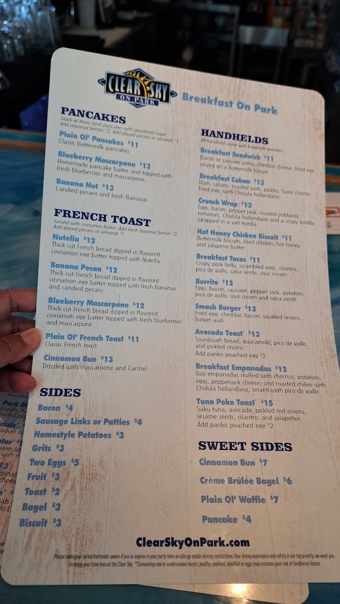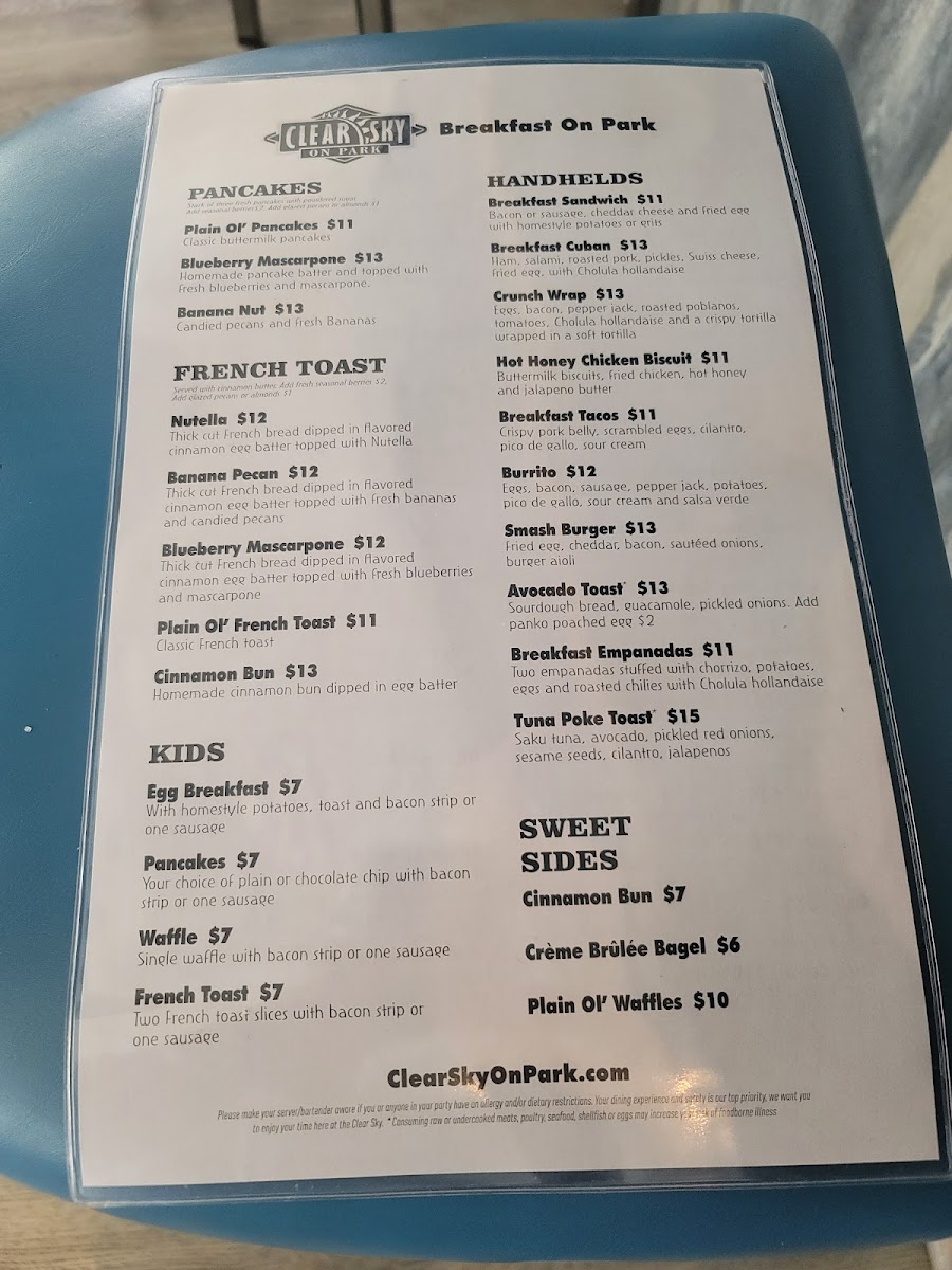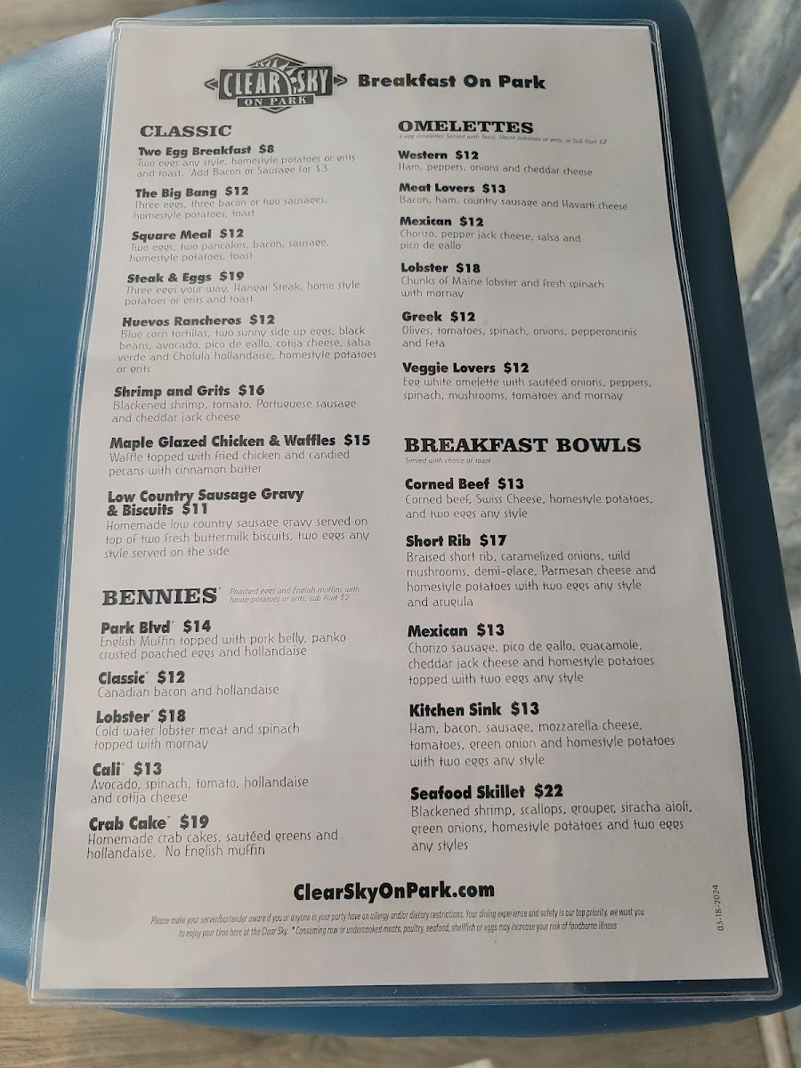 Clear Sky on Park in Seminole, FL offers an inviting American menu that blends classic comfort with fresh, artful presentations. From hearty breakfasts like the flavorful Mexican bowl—with fluffy eggs and fresh guacamole—to standout entrees such as Stuffed Grouper and Chicken Piccata, each dish dazzles with vibrant flavors and thoughtful preparation. The Key Lime Pie is a must-try dessert, perfectly balancing sweetness and tartness.